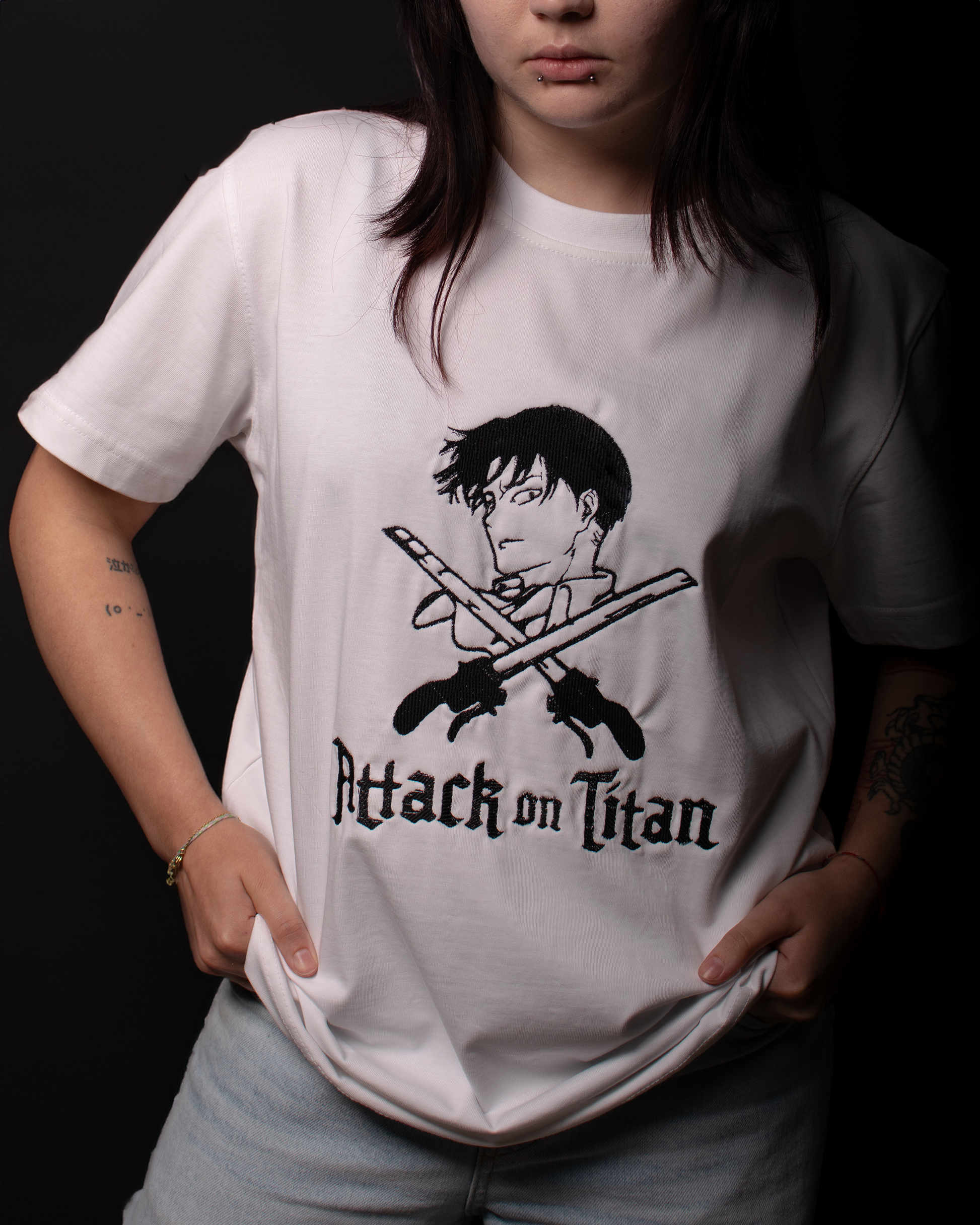 Frontline focus, backstory in every stitch. This embroidered Attack on Titan tee features a dual-sided design that speaks volumes: a determined soldier with twin blades on the front, and three intense sets of eyes on the back — each one hiding a story of survival, loyalty, or betrayal.
