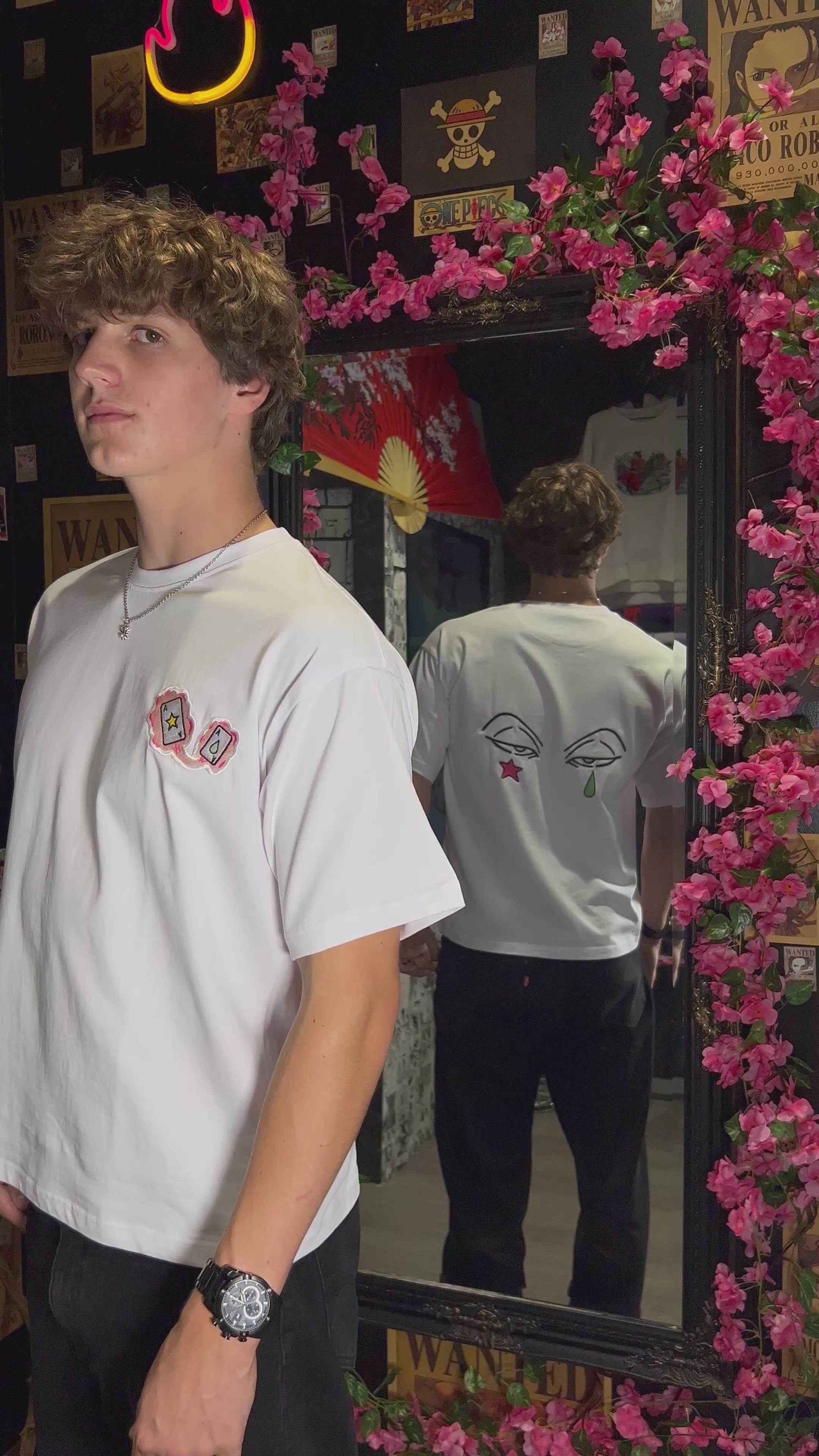 Unleash your inner trickster with this embroidered Hisoka T-shirt inspired by Hunter x Hunter. On the front, two embroidered playing cards (star & teardrop) symbolize Hisoka’s iconic motifs. The back features his piercing eyes with the same star and tear design, perfectly capturing his enigmatic presence.