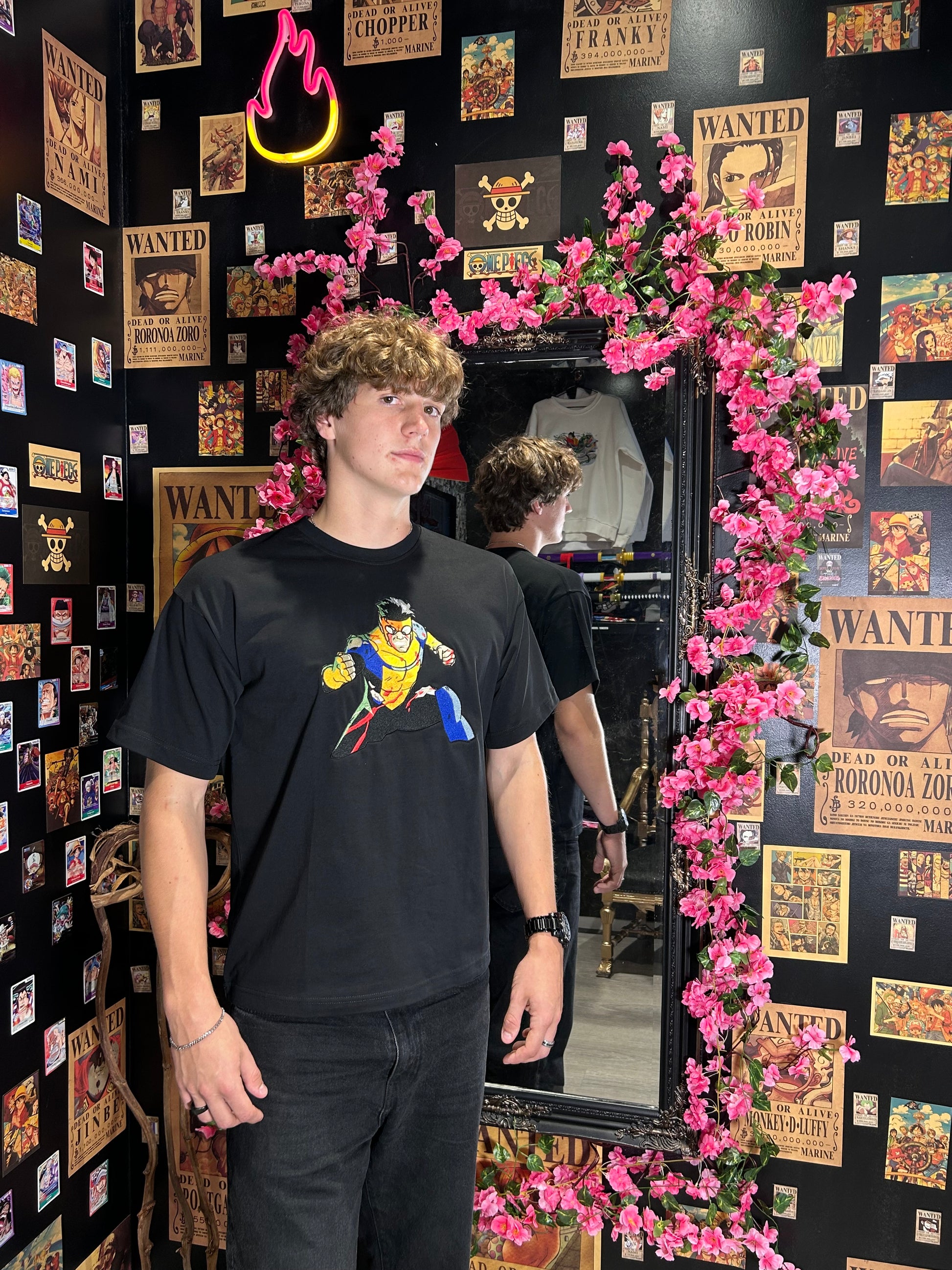 This black tee features a bold embroidered design of Mark Grayson, the young hero from Invincible. With his iconic yellow and blue suit, this shirt captures the energy and determination of one of the most talked-about superheroes of the modern era.