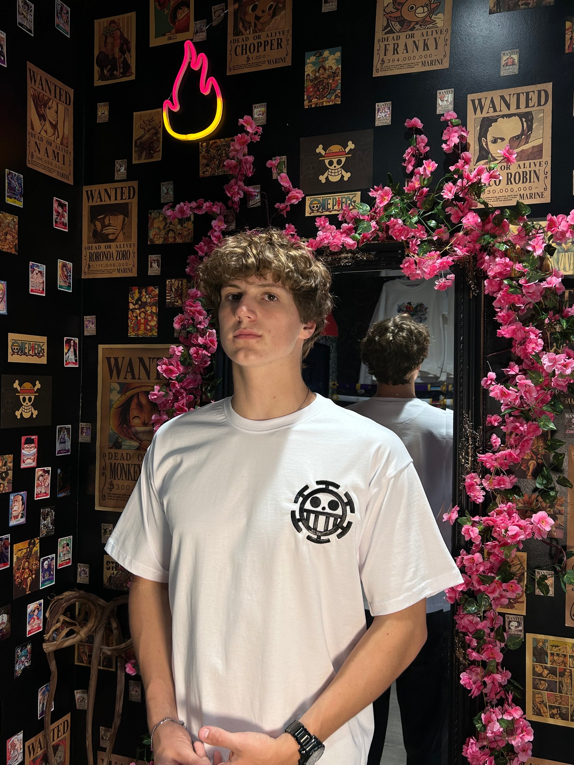 This minimalist yet bold t-shirt pays tribute to Trafalgar Law and the Heart Pirates, one of the most iconic crews in One Piece. Featuring a clean embroidered design of the Heart Pirates’ jolly roger, it’s a symbol of freedom on the seas and the will to fight for your own path.