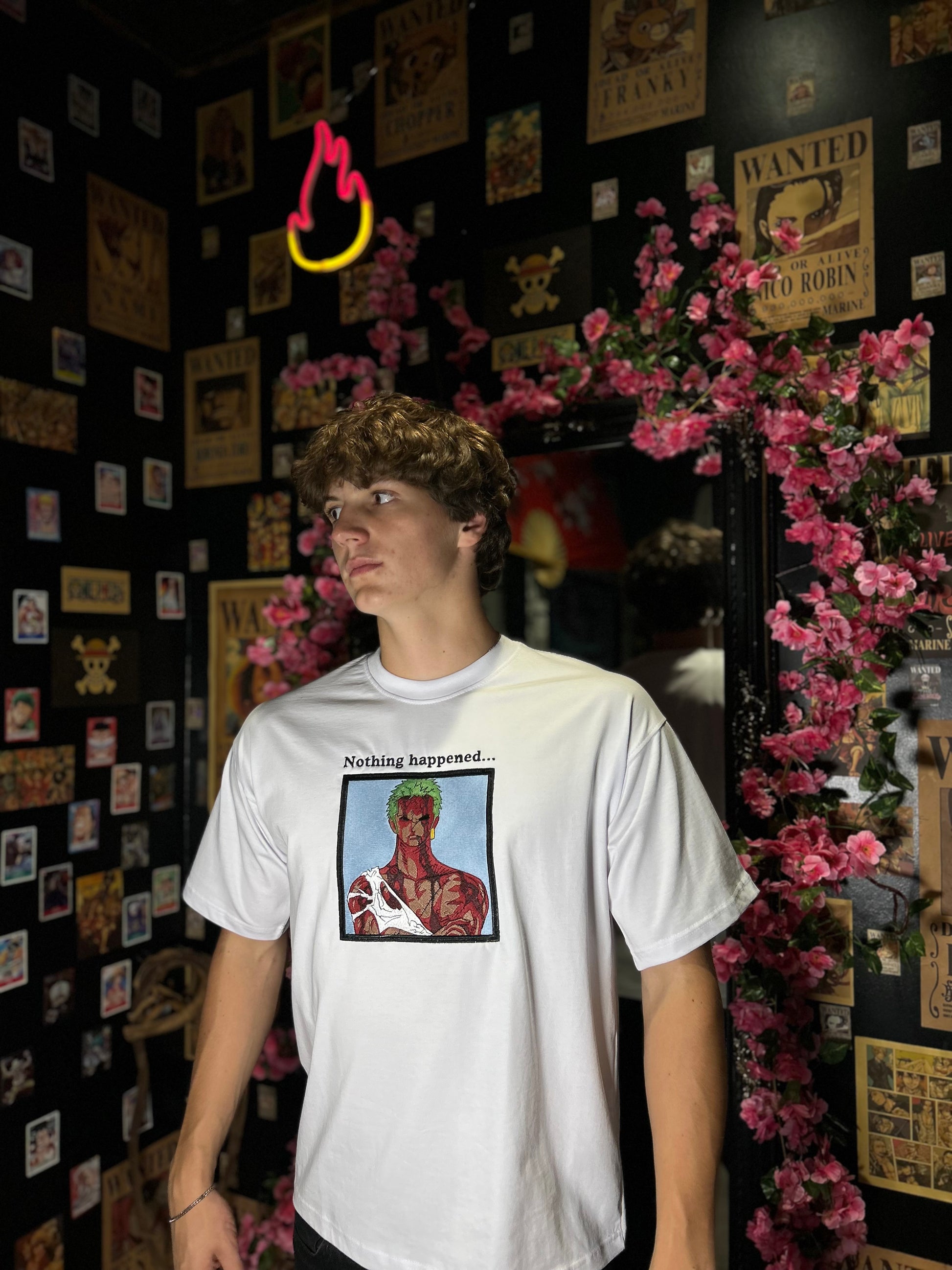 This bold embroidered tee captures one of the most unforgettable moments in One Piece history — Roronoa Zoro, standing wounded and bloodied, yet refusing to fall. With the powerful phrase “Nothing happened” stitched above, this shirt pays tribute to Zoro’s loyalty, endurance, and unshakable will.